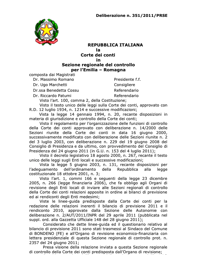(n.d.r. A questo punto mi sarebbe piaciuto che la dirigente avesse anche scritto Vista la raccomandazione della Corte dei Conti dell'Emilia Romagna del 14.12.2011 , trasmessa al consiglio comunale in data - non si sa - Mentre mi chiedo se i consiglieri comunali quando hanno approvato queste deliberazioni fossero a conoscenza della raccomandazione della Corte dei Conti, e mi rispondo che se non lo erano, ne possono prendere visione ora in calce a questo post (*) . )